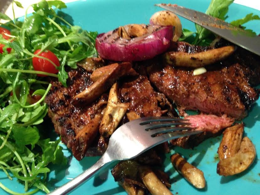 Rib Eye Steak served with Blue Oyster Mushrooms, Grilled Red Onion and Arugula Salad