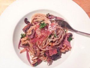 Linguine with Sauteed Mushrooms, Toasted Walnuts and Crispy Prosciutto