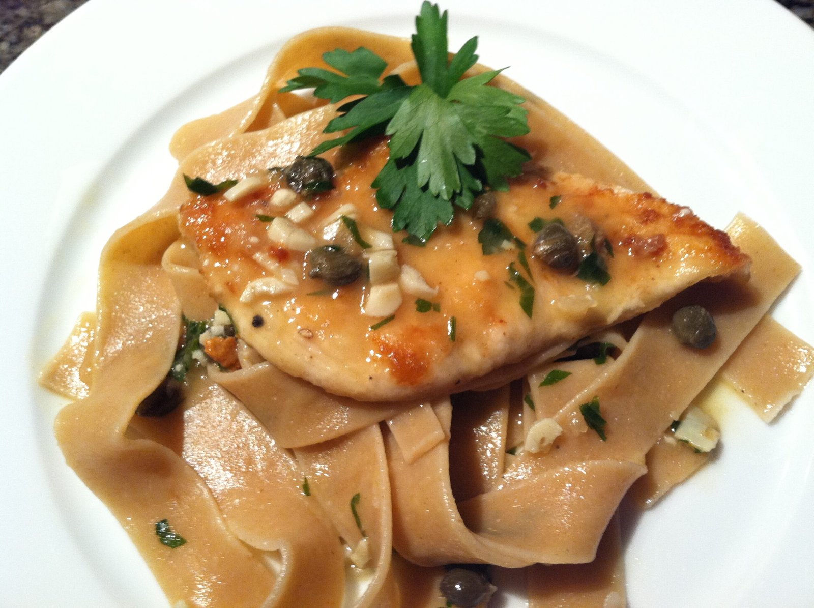 Chicken Piccata Served Over Whole Wheat Pappardelle Pasta